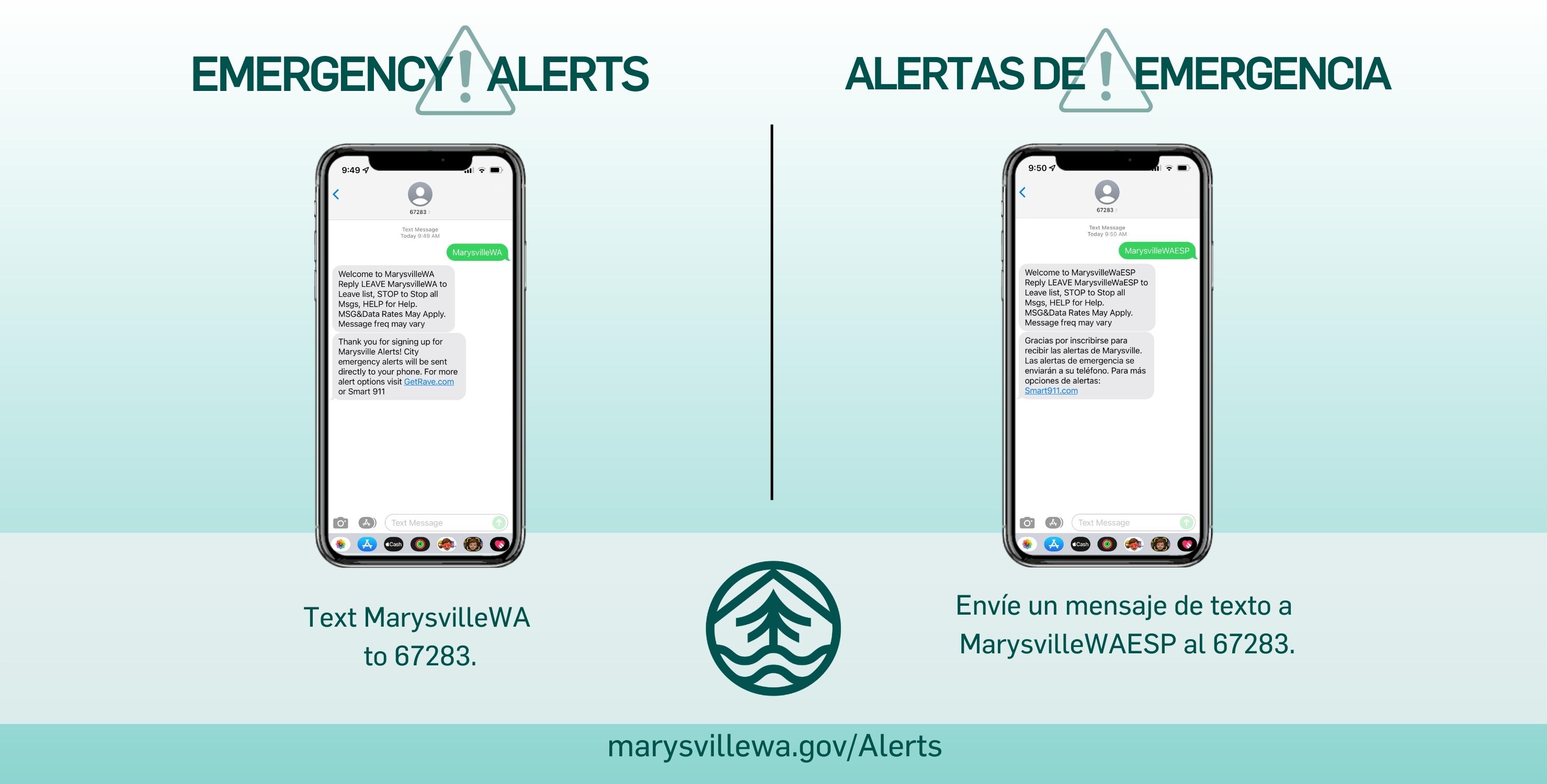 To sign up for Marysville Alerts in English text MarysvilleWa to 67283. Para recibir alertas de emergencia en español, envíe un mensaje de texto con la palabra MarysvilleWaESP al 67283.