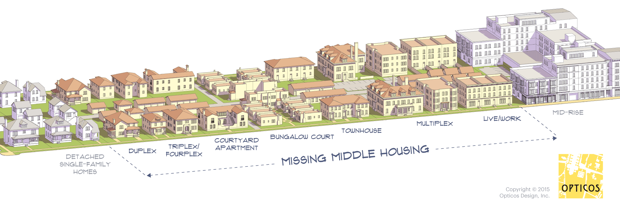 Middle housing is a range of housing types that include two or more attached, stacked, or clustered homes that are compatible in scale and form with detached single-family homes and neighborhoods. Middle Housing consists of a variety of housing types that are in between the size and number of dwelling units for single-family residences and apartments as shown in the image below.